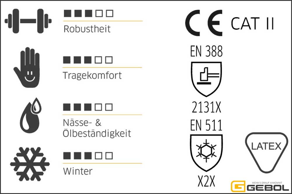 Hände brauchen besonders an kalten Wintertagen einen speziellen Schutz. Der Gebol Winter Grip – ein nahtloser Mittelstrick-Handschuh aus Acryl – bietet durch seine Materialkombination wärmenden Schutz auch bei Kontakt mit kalten Gegenständen. Die Latex-Schaum-Beschichtung mit Sandy-Finish an der Handinnenfläche gewährleistet eine sichere Griffigkeit auch bei nassen und rutschigen Arbeiten am Bau, in der Werkstätte oder im Kühllager. Die Beschichtung ist darüber hinaus feuchtigkeitsabweisend, dadurch bleiben die Hände trocken und werden zusätzlich vor Kälte geschützt. Vor allem Robustheit, Griffsicherheit, hoher Tragekomfort und optimale Passform zeichnen den Winter Grip für alle Tätigkeiten bei kalten Temperaturen aus.