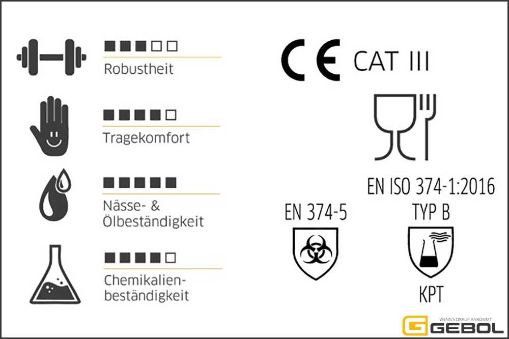 Der Gebol Einweghandschuh Black Nitril Ultra Strong besteht aus schwarzem Nitril mit einer Polymerbeschichtung für ein unkompliziertes, leichtes Anziehen und eine perfekte Passform. Der hochwertige Einweghandschuh zeichnet sich vor allem durch die extreme Nässe- und Ölbeständigkeit aus. Die texturierten Fingerspitzen unterstützen Arbeiten mit öligen und feuchten Gegenständen, die eine besondere Griffigkeit verlangen. Der Handschuh bietet eine hohe Elastizität und Reissfestigkeit, ist beidseitig tragbar und silikonfrei hergestellt. In einer Box befinden sich 80 Stück. Der Nitril Einweghandschuh ist für Arbeiten im Gesundheits-, Lebensmittel-, und Hygienegewerbe bestens geeignet.