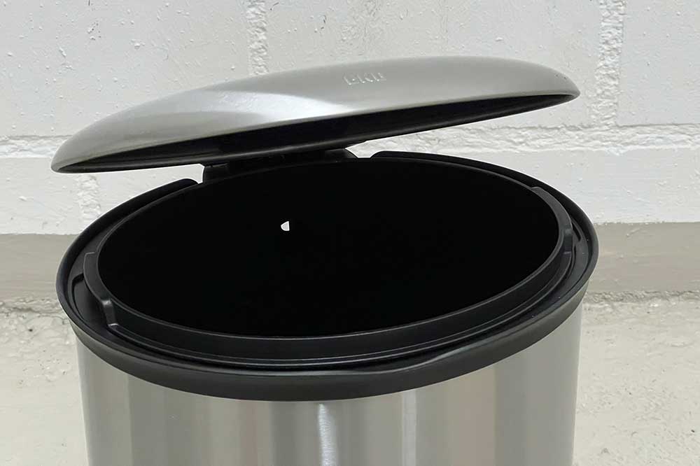 Der EKO Ellipse Tretmülleimer aus hochwertigem mattem Edelstahl besitzt einen herausnehmbaren Inneneimer und einen angenehm leise schliessenden Soft-Close-Deckel.