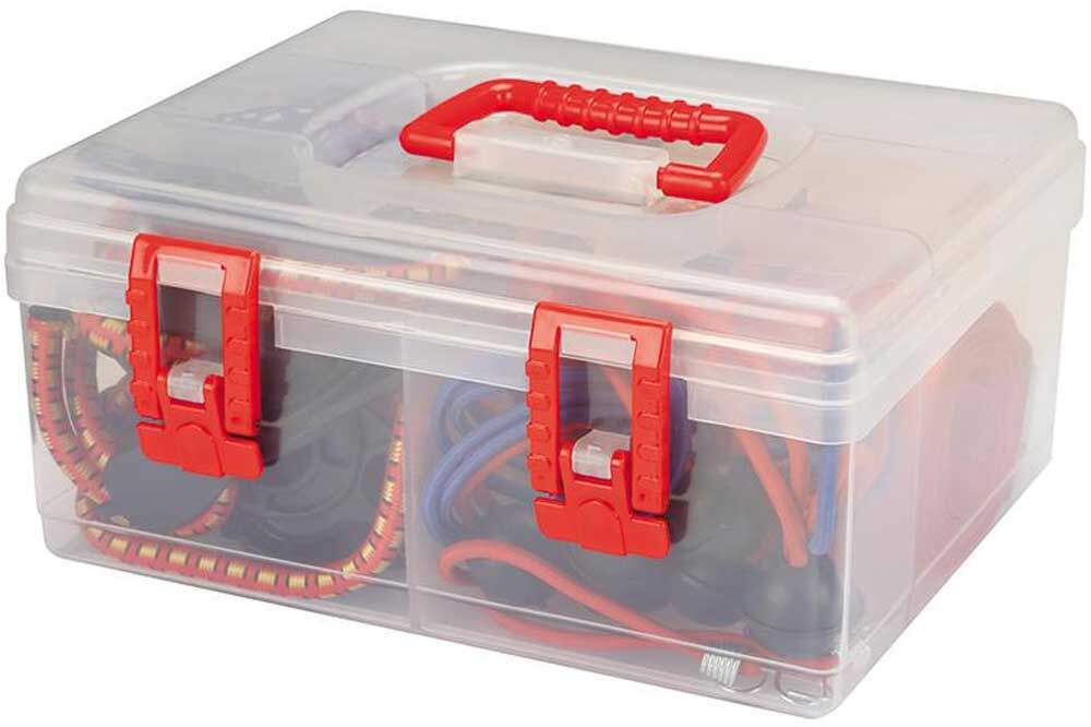 Dieses 18-teilige Set liefert alles, was Sie zum Befestigen und Festzurren brauchen. Neben zwei einzelnen Zurrgurten sind in der Box auch noch zwei mit Ratsche und Haken enthalten. Von den insgesamt 14 Gepäckspannbändern werden vier mit grossen Haken und zwei mit kleinen Haken geliefert. Zudem enthält das Set zwei Gepäckspannbänder mit Kunststoffhaken und sechs Gepäckspannbänder mit Kugel.