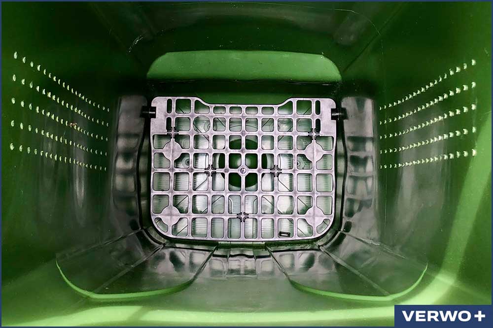 Bei dieser Version als Kompostbehälter wird mittels befestigtem Siebeinsatz und seitlichen Lochungen die Geruchsbildung spürbar reduziert. Zusätzlich findet bereits im Behälter eine Vorkompostierung statt.