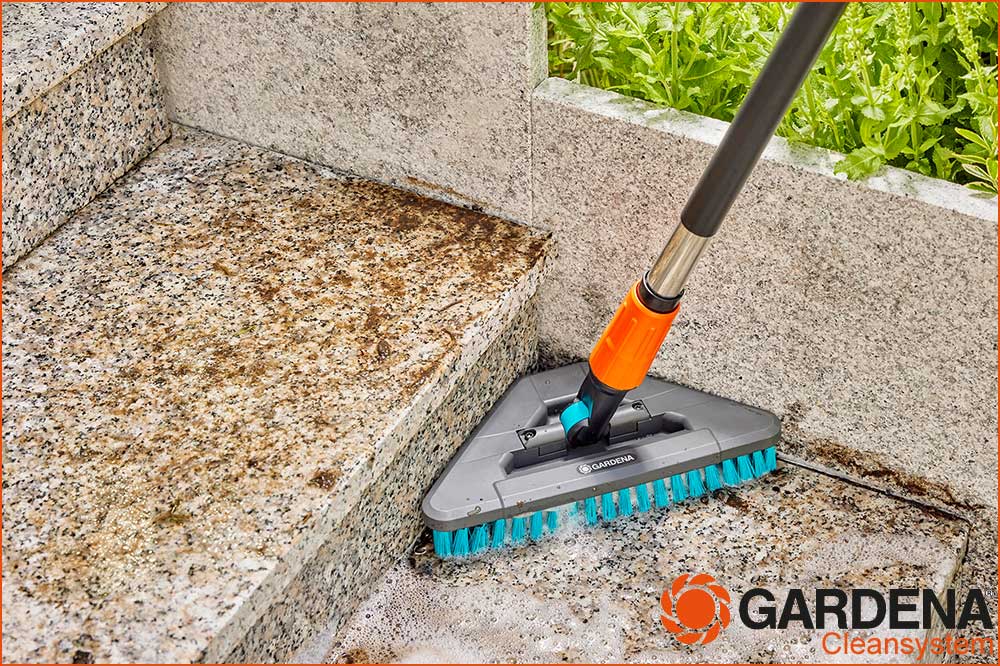 Die harten Borsten der dreieckigen Bürste wurden speziell für alle unempfindlicheren Flächen im Aussenbereich entwickelt. Die gründliche Reinigung grosser robuster Flächen gelingt damit optimal – egal, ob es sich um Terrassenböden, Steintreppen oder Innenhöfe handelt. Mit der wasserführenden harten Bürste lässt sich grober und hartnäckiger Schmutz im Handumdrehen entfernen.