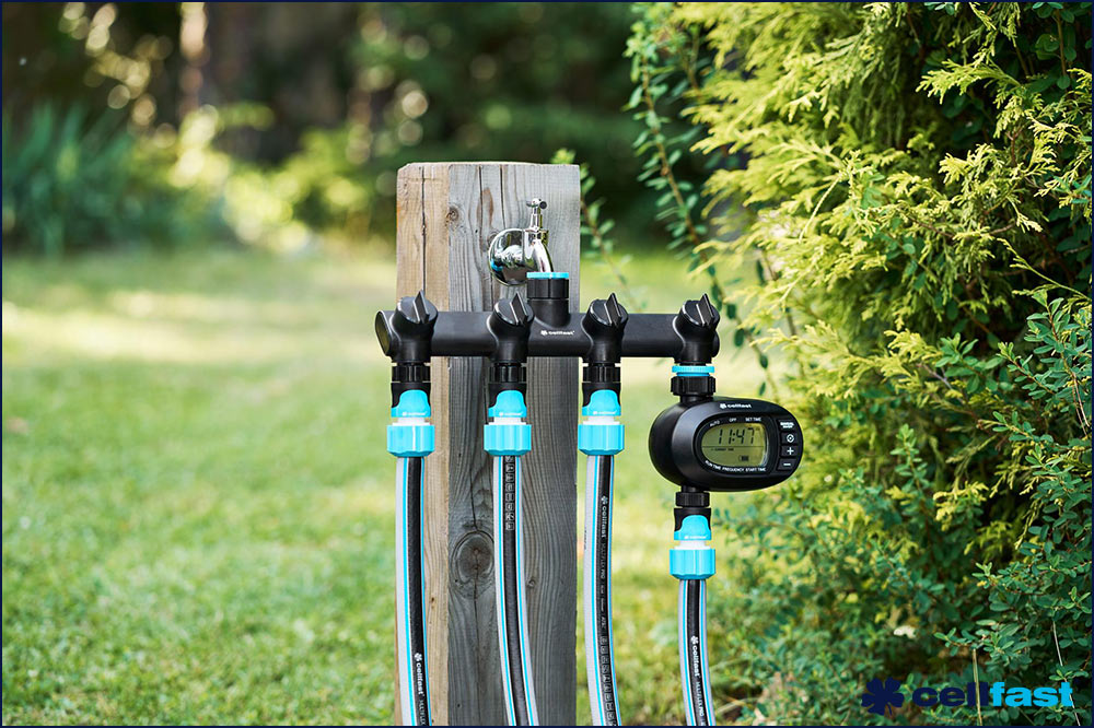 der Wasserfluss ist für jeden Eingang getrennt regulierbar. Anhand des Adapters lassen sich Schläuche mit verschiedenem Durchmesser mit dem Verteiler verbinden. Ein breiter Abstand der Anschlussstücke ermöglicht das Anschliessen von grossem Bewässerungszubehör (z.B. Bewässerungscomputer).