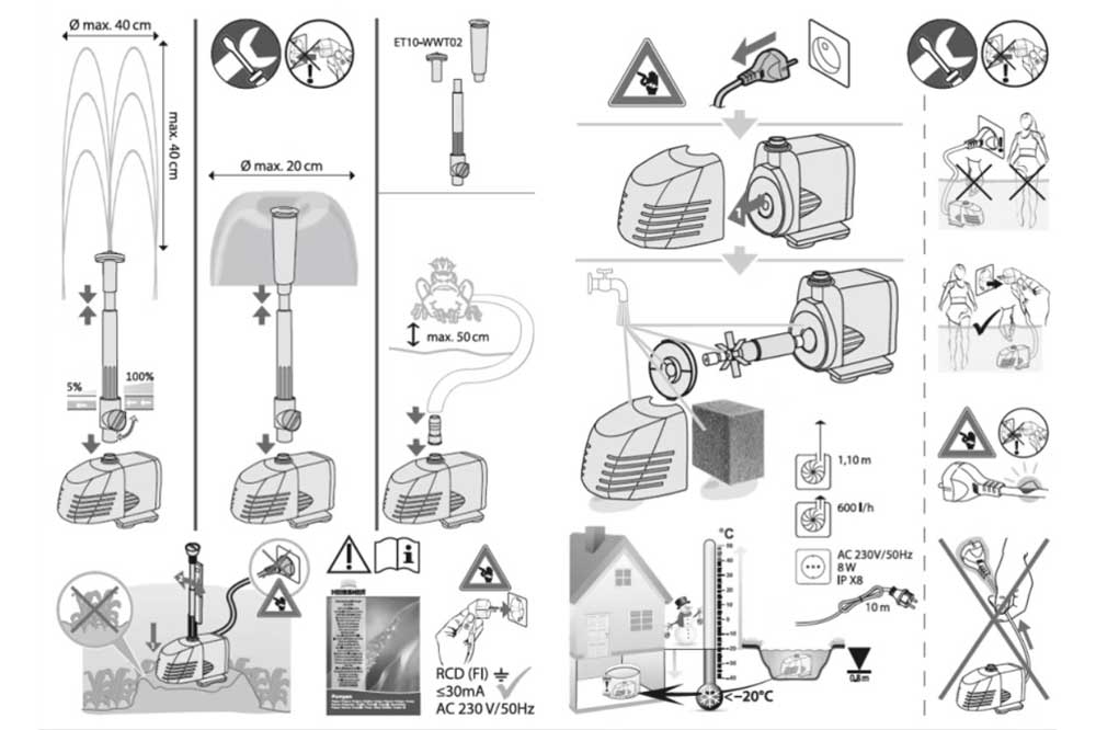 Für den Betrieb von Wasserspielen, Teichschalen, Teichfiguren, Mini-Quellsteinen und Zimmerbrunnen in Gebäuden.