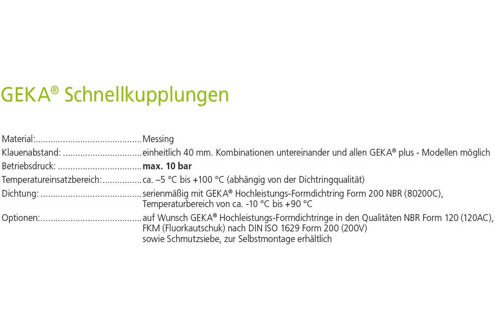 - Dichtung: serienmässig mit GEKA® Hochleistungs-Formdichtring Form 200 NBR (80200C),