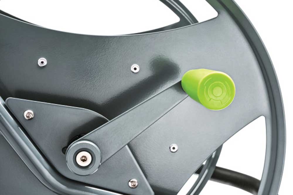 Automatischer Schlauchaufroller aus pulverbeschichtetem Stahl.