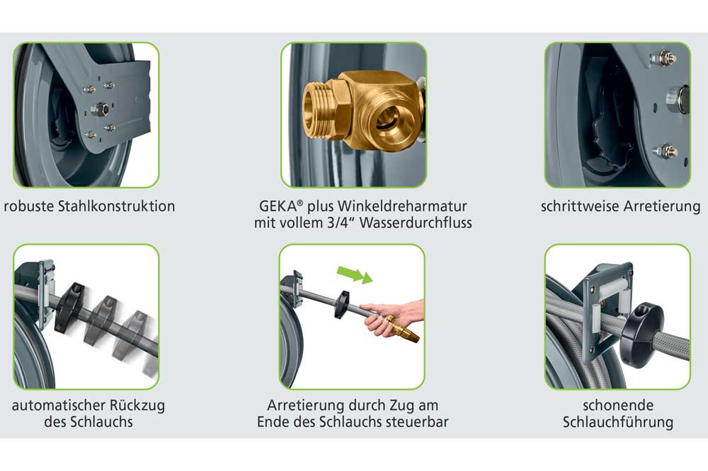 - automatischer Rückzug des Schlauchs mit schonender Schlauchführung