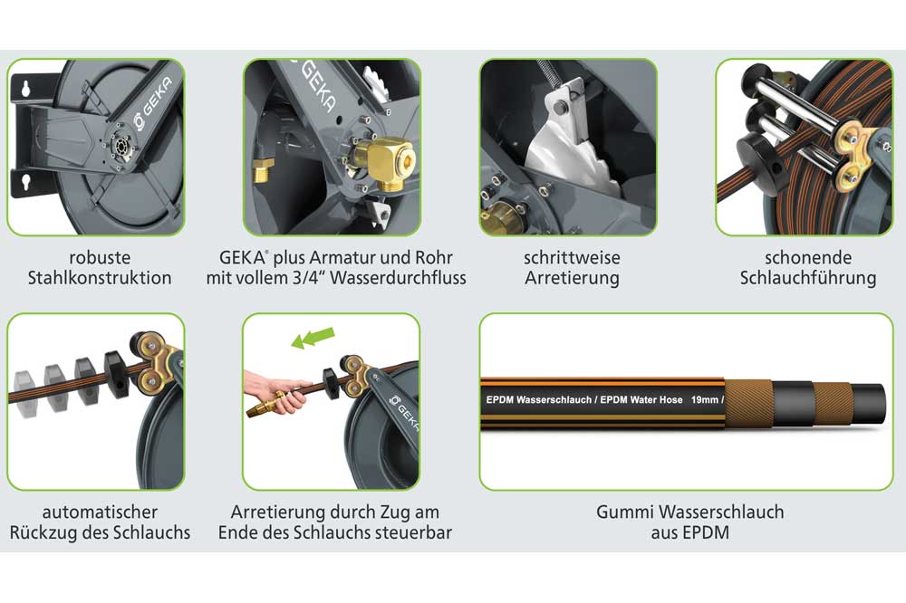 Automatischer Schlauchaufroller aus pulverbeschichtetem Stahl inkl. 25 m GEKA® plus Gummi Wasserschlauch 3/4“, hochwertigen, robusten Schnellkupplungen und Spritzdüse aus Messing + 2 m Zulaufschlauch. GEKA® plus Gummi Wasserschlauch 3/4“ aus EPDM, 5-lagig mit synthetischen Garnen, ID 19 mm, Wandstärke 4 mm.