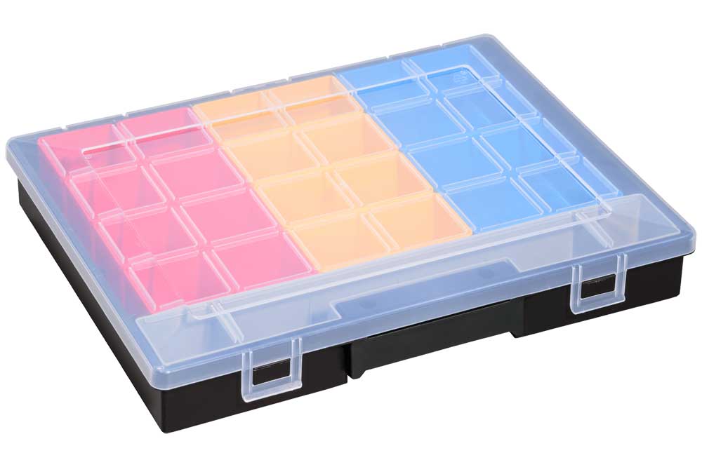 Sortimentskasten mit unterschiedlich grossen Fächern in unterschiedlichen Farben.