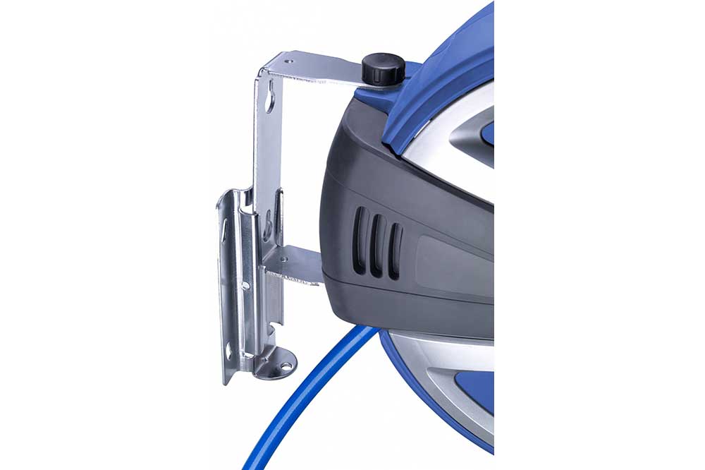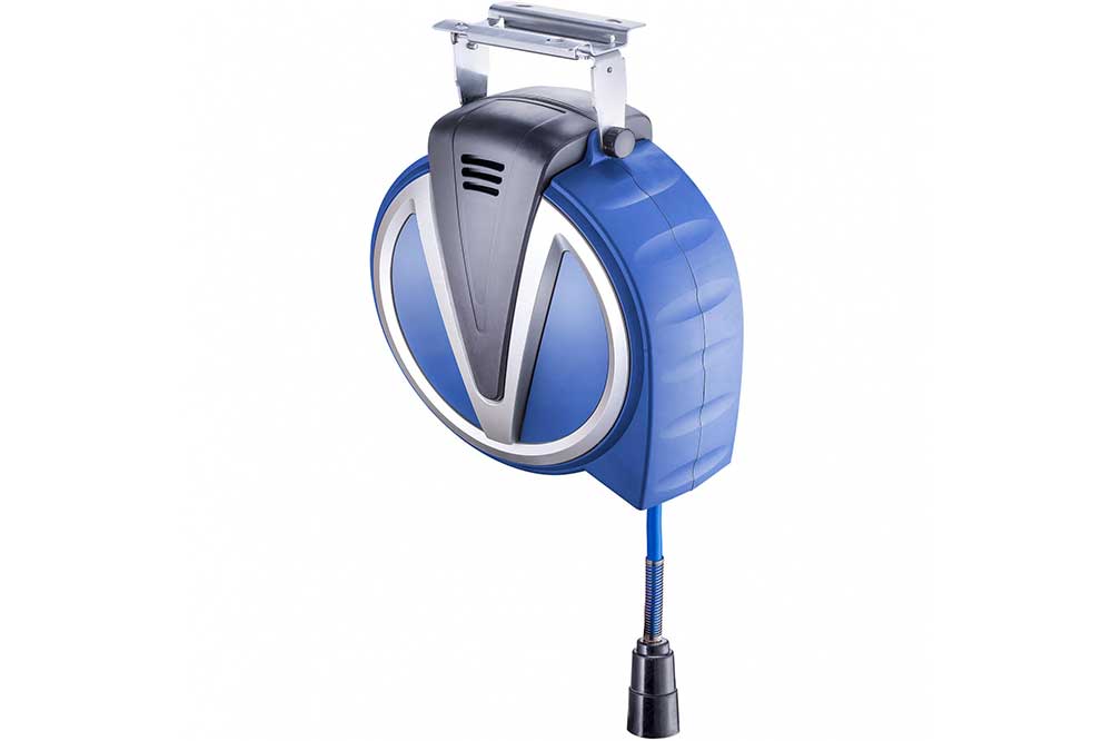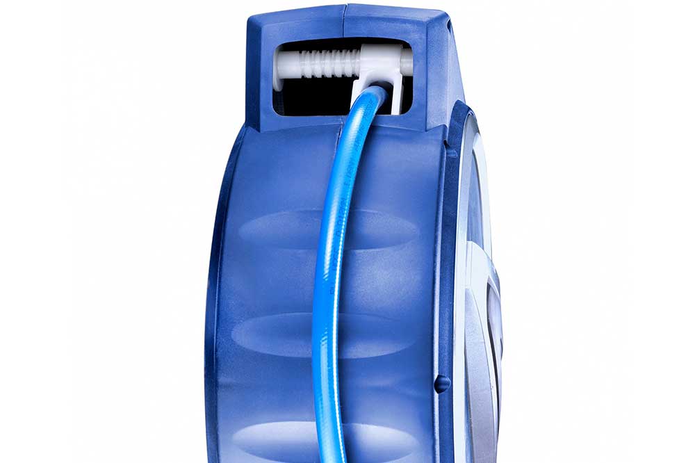 Druckluftschlauch im kompakten, robusten Kunststoffgehäuse. Geführter Kabelrücklauf sorgt für sauberes Aufrollen.