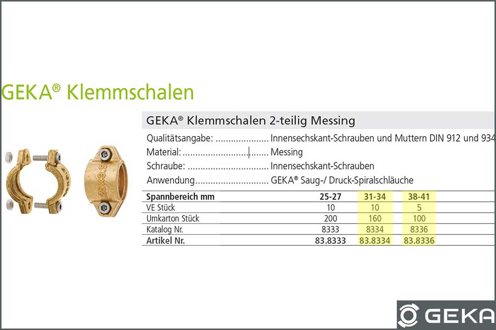 Die 2-teiligen GEKA®-Klemmschalen, gefertigt aus hochwertigem Messing CW617N, sind ein unverzichtbares Zubehör für die sichere Befestigung von GEKA®-Saug- und Druck-Spiralschläuchen.