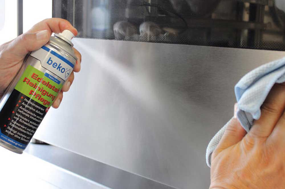 Leichtes und dosiertes Aufsprühen, lässt sich rückstandsfrei einarbeiten, kein Scheuern auf der Edelstahlfläche, mit trockenem und fusselfreien Tuch, leichte bis mittlere Verschmutzungen lassen sich problemlos entfernen, lässt Wasser abperlen.
