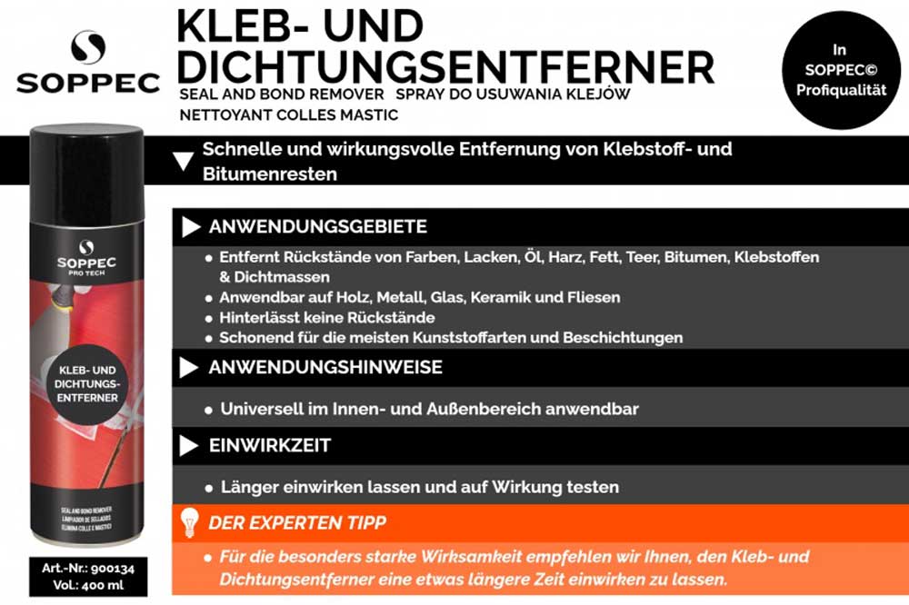 Der Kitt- und Klebstoffentferner von Soppec PRO TECH entfernt schnell und einfach Klebstoff-, Bitumen-, Kitt- und Silikonreste.