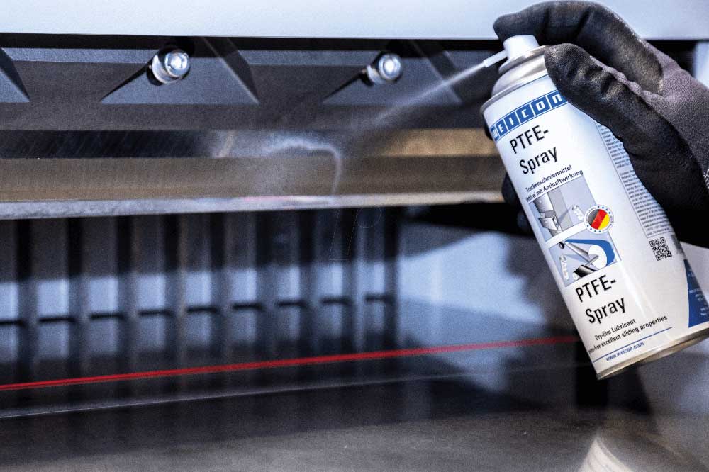 WEICON PTFE-Spray haftet auf allen Metall-, Kunststoff- und Holzoberflächen. Durch den hohen PTFE-Anteil wird der Reibwert deutlich verringert. Die Beschichtung ist schmutz-, staub- und wasserabweisend sowie beständig gegen Öle, Fette und viele Chemikalien. PTFE-Spray wird als Dauerschmierung an Gleit- und Laufschienen sowie Führungen, an Förderbändern, Transportrollen und -rutschen, an Fenstern, an Schneidewerkzeugen und Verpackungsmaschinen eingesetzt. Als wasserabweisende Beschichtung von Papier- und Korkdichtungen sowie von Dichtungspackungen, an Stelle siliconhaltiger Trennmittel und überall dort, wo eine Öl- oder Fettschmierung nicht zulässig oder erwünscht ist.