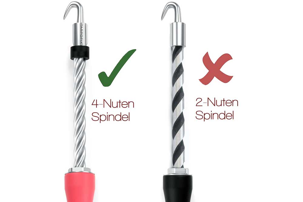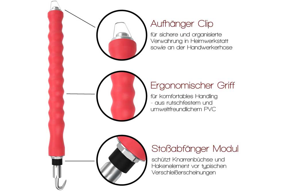 Drillspindel aus robustem Carbon-Stahl, extra mechanisch verfestigte Haken sowie rutschfeste PVC Griffe in ergonomischer Form.